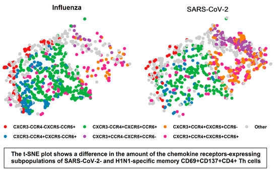 The t-SNE plot of different chemokine receptors-expressing subsets of SARS-CoV-2- and influenza-specific memory CD69+CD137+ CD4+ Th cells. The t-SNE analysis was performed using the cell fluorescence data from H1N1 and SARS-CoV-2-stimulated samples. A random sample (n = 800) was selected from each group. t-SNE was performed using R version 4.0.0. The perplexity parameter was set to 40. The iteration number was 1500.