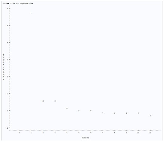 Scree plot of the eigenvalues for the determination of the number of factor groups. The scree plot is used to determine the number of factors to retain in an EFA or principal components to keep in a principal component analysis (PCA). The “elbow” of the scree plot is where the eigenvalues seem to level off and aids in the determination of the number of factors.