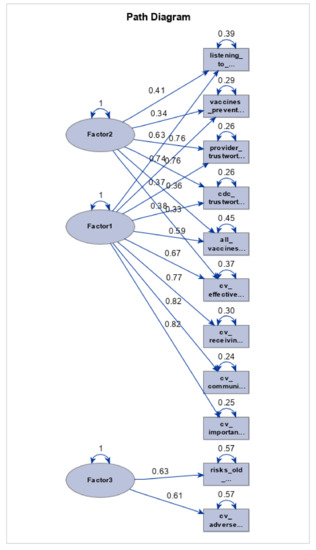 Descriptive statistics were used to characterize the study population and survey responses. Exploratory and Confirmatory Factor Analysis (EFA and CFA) with varimax rotation was used to evaluate the vaccine hesitancy items and identify domains. Various domains, such as lack of confidence, risk factor concern, and misinformation, have been utilized in prior studies to analyze these questions [36,37]. The sample data was divided into two components, where half of the sample was used for EFA and the other half was used for CFA. EFA was performed using varimax rotation with eigenvalues > 1, enforcing a three-factor solution. Reliability analyses were used to assess the internal consistencies of each set of items. In the EFA, we performed maximum likelihood estimation and principal components analysis. Following EFA procedures, CFA was then performed using maximum likelihood estimation. Modeling goodness of fit measures such as Adjusted Goodness of Fit (AGFI), Overall χ2, Root Mean Square Error of Approximation (RMSEA), comparative fit index (CFI), and Akaike’s information criterion (AIC) were assessed to provide the validity of how plausibly a specific model fits to the data. Ten iterations of random samples for both EFA and CFA validated that the results were fairly similar through each iteration. Based on each iteration, eigenvalues determined that a three-factor solution for each iteration and goodness of fit measures were consistent. Factor scores were constructed based on summing the individual items with equal weights. A response of strongly disagree equated to 1, disagree to 2, neutral to 3, agree to 4, and strongly agree to 5. For health benefit, a score of 30 was assigned to high benefit, 27–29 to medium benefit, and 26 or less to low benefit. For trustworthiness, a score of 14–15 was assigned to high trust, 12–13 to medium trust, and 11 or less to low trust. For risk concern, a score of 8–10 was assigned to high risk concern, 5–7 to medium risk concern, and 4 or less to low risk concern. General descriptive statistics were performed comparing the three factors using a Pearson Chi-Squared test on categorical variables to assess whether each factor is likely to be independent, and a one-way analysis of variance (ANOVA) test on continuous variables to assess if mean scores between factors are likely to be similar. Multinomial logistic regression analyses were performed, observing the association between demographic variables and each of the three factors. All analyses were performed using SAS (9.4) statistical software packages. A statistically significant association was defined as a two-sided p < 0.05 and a confidence interval of 95%.