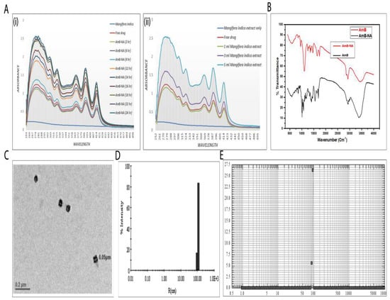 The spectroscopic assessment suggested that as-synthesized AmB-NA retained the UV-absorption characteristics of the parent AmB compound and bears a resemblance to super-aggregates of AmB. A significant hypsochromic shift in the absorption spectrum of the as-synthesized AmB-NAs was monitored, with the highest peak around 280 nm. The time kinetic data of the synthesis revealed a similar characteristic spectrum at various time points where magnitude of the absorption peaks changed (first reduction until 6 h post initiation, followed by increment) with time. To avoid ambiguity, the free AmB (pure drug) absorption spectrum was noted immediately after its mixing with Mangifera indica pulp extract, considered as the zero time point observation. The interaction ensued quenching in the absorbance intensity of several characteristic absorption peaks of the AmB up to 6 h (Figure 1A(i)). A substantial elevation in intensity was detected after 8 h, which was greater than the intensity of free AmB at the zero time point. Altogether, slow nanoparticle formation was noticed and found to be accomplished in 24 h. After 18 h, no significant difference was noticed up to 24 h, and beyond that, it did not result in any further upsurge in optical density. To remove the mango extract trace, the AmB-NA thus formed were pelleted and washed carefully. Likewise, the consequences of increasing Mangifera indica pulp extract concentrations on nanoparticle super aggregation formation were monitored. At a fixed time (24 h), insignificant variation was observed in a reaction mixture containing AmB and mango pulp in the ratio of 1:5, whereas a significant uptick was noted with a 3:5 ratio (Figure 1A(ii)).