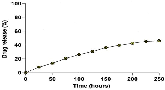 The biomimetically synthesized nano-assembled AmB was evaluated for the release of core AmB drugs under physiological conditions in PBS at pH 7.4 and temperature of 37 °C. Drug release kinetics was studied using the dialysis diffusion method for a time period of 250 h. The percentage release of drug versus time (in hours) was plotted as shown in Figure 2. The nanoassemblies showed a moderate release pattern over a period of 250 h. The release began with an immediate initial burst, and at the completion of 125 h, about 30 ± 1.9% of the AmB drug had been released into the PBS. It can be seen that about 46 ± 1.0% of the nano-assembled drug was released into PBS upon the completion of 250 h. The graph depicts the sustained release of AmB over an extended period of time.