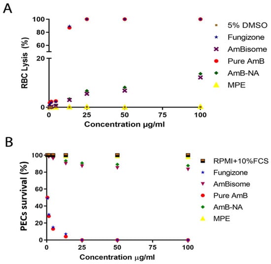 The cytotoxic effect of the as-synthesized AmB-NA formulation was also evaluated against mouse peritoneal exudate cells (PECs) as previously reported with minor modifications []. For this, the BALB/c mice were humanely sacrificed, and PECs were isolated from peritoneal lavage in a sterile condition. The PECs were washed twice with sterile Hanks balanced salt solution (HBSS) by centrifugation at 500× g for 15 min at 4 °C and suspended in complete Roswell Park Memorial Institute (RPMI)-1640 medium. The cell density was adjusted (1 × 106/mL) and cultured (200 µL/well) in a Lab-TekR chamber slide (NuncTM) in a CO2 incubator (for 48 h at 37 °C). Next, the PECs were exposed to increasing concentrations of AmB-NA and incubated in a CO2 incubator for 24 h at 37 °C. Post incubation, the effect of AmB-NA on PECs was analyzed, employing microscopic analysis and MTT assay (3-(4,5-dimethylthiazol-2-yl)-2,5-diphenyltetrazolium bromide). The optical density of the colored complex was measured at 570 nm using a spectrophotometer (Bio-Rad, Hercules, CA, USA), plotted against nanoparticle concentration.