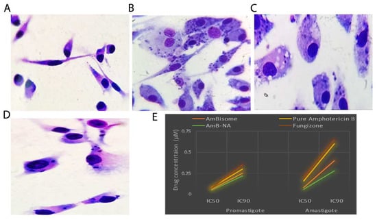 The parasiticidal activity of the as-synthesized AmB-NA against intracellular amastigotes and promastigotes was evaluated as described earlier with slight modifications, as standardized in our laboratory []. Giemsa staining was used for the evaluation of amastigote activity. PECs-derived macrophages were challenged in the metacyclic stage of L. donovani (Ld) promastigotes at a macrophage to parasite ratio of 1:10 followed by incubation in a CO2 incubator for 48 h for their conversion to amastigotes. Non-internalized parasites were removed by gentle washing with an RPMI-1640 medium. Subsequently, infected macrophages were treated with increasing concentrations of AmB-NA (0.5–1.0 μM). The treated cells were further incubated for another 48 h with a complete RPMI-1640 medium. The untreated cells served as a negative control, and pure AmB drug-treated wells were considered as positive control. Next, Ld promastigotes (1 × 106 cells/mL) were incubated with AmB-NA, AmBisome®, and Fungizone® at various concentrations (0.05–1.0 µM) for 48 h, and cell viability was measured by microscopy and an MTT assay using standard procedures. The MTT experiment was performed by adding 10% MTT reagent to the culture medium followed by 4 h incubation. A corresponding amount of solubilizing agent was applied. The complete culture was transferred to a 96-well plate and mixed well, and the optical density was measured at 570 nm using an ELISA plate reader. After 48 h, the drug concentration that resulted in 50% parasite death was referred to as the IC50; proportionately, the drug concentration that resulted in 90% parasite killing was referred to as the IC90. Coherently, CC50 was also calculated which refers to the cytotoxic concentration of the formulations required to kill 50% of the viable macrophage. The selectivity index (SI = CC50/IC50) was calculated to prove the anti-leishmanial potential of the drug. SI is ideal to achieve a high therapeutic index that delivers the highest antileishmanial efficacy with the least amount of cell damage.