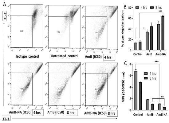 The JC-1 (5,5′,6,6′-tetrachloro-1,1′,3,3′-tetraethylimidacarbocyanine iodide) dye (Invitrogen) [] was used to evaluate the alteration in the ΔΨm of L. donovani membrane []. The JC-1 dye fluoresces differently within living and dead cells. It is kept inside living cells’ mitochondria in the form of J-aggregates, but in damaged cells, it is released from the mitochondria and dwells in the cytoplasm in a monomeric state (J-monomers). In general, the ratio of J aggregates (red) to J monomers (green) indicates the cell’s relative Ψm []. Briefly, to determine ΔΨm in Ld, the promastigotes (1 × 106 mL/L) were incubated in the absence or presence of IC50 of AmB-NA for 6 h at 22 °C in a BOD incubator. AmB was also tested at the same concentration in parallel. Post-treatment, the cells were harvested, washed twice with PBS, and finally stained with JC-1 (10 μg, 20 min, 37 °C). Following labelling, the cells were washed twice with PBS, and fluorescence was measured using a FACS Caliber flow cytometer (excitation at 488 nm and emission at 530/585 nm for green and red channels, respectively). To ascertain the ΔΨm, we need to differentiate the red J-aggregates from J-monomers; the red (J-aggregates)/green (J-monomer) ratio (i.e., 585/530) was determined using the FlowJo software.