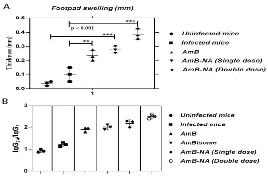 DTH as a pointer of elicitation of cell-mediated immunity was noticed in all the experimental BALB/c mice 4 weeks post-treatment. Mice were inoculated with 50 μg of SLA (μg/μL) in the left hind footpad, and an equal volume of PBS (50 μL) was injected in the right hind footpad. The DTH response was assessed by measuring the differential footpad oedema (left-right) 48 h after antigen (SLA) treatment using Vernier callipers, as described previously [,,,,].
