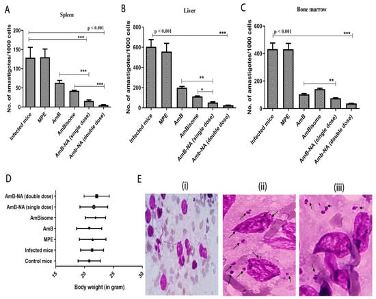 All animals were intraperitoneally (IP) inoculated with Leishmania parasites (1 × 107/mL), except Group-I, which served as the uninfected control. Confirmation of infection was evaluated in two arbitrarily selected mice six weeks post-infection. Subsequently, infected mice groups were treated IP with respective drug regimens AmB-NA at 10 mg/kg body weight (bw), AmBisome (10 mg/kg bw), and AmB (1 mg/kg bw) or PBS; AmBisome and AmB-NA was administered twice, at day 1 and day 16 (i.e., at a fifteen- day interval) in a volume of 100 µL, whereas for AmB, it was every alternate day for 15 days. At two weeks post-treatment, mice were humanely sacrificed, and the presence of L. donovani amastigotes was quantitatively analyzed by dabbing the liver, spleen, and bone marrow, followed by Giemsa staining. The parasitic burden was monitored microscopically by counting the number of amastigotes per 1000 fields.