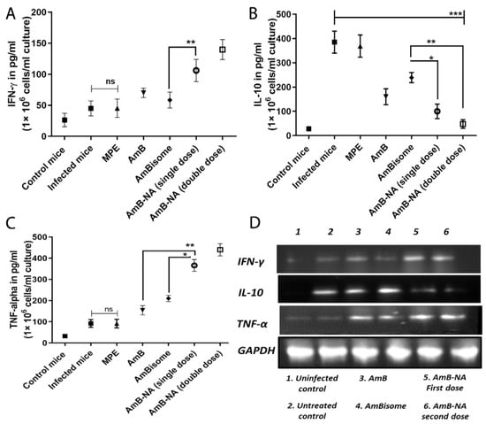 To assess the T helper type (Th1) stimulatory potential of AmB-NA in BALB/c mice, the extracellular cytokines were assessed by an enzyme-linked immunosorbent assay (ELISA) kit of mouse splenocytes as described earlier with minor changes []. Following sacrifice, spleens were aseptically harvested from normal, infected, and treated mice 4-week post-treatment. Spleens thus obtained were processed for procuring splenocytes single-cell suspension. The obtained splenocytes were cultured and incubated in a CO2 incubator at 37 °C. After 48 h of SLA stimulation, the cell-free culture supernatants from all experimental groups were collected and quantitively examined for cytokines (IL-10, IL-12, IFN-γ, TNF-α) using ELISA (BD OptEIATM) kits as per the protocol supplied with the respective kit. Variation in various cytokines expression level was further authenticated by reverse transcription polymerase chain reaction (RT-PCR). Reverse transcription was executed using 1 μg of total RNA employing a cDNA synthesis kit (Roche, Carlsbad, CA, USA). The synthesized cDNA was amplified by PCR. The primer sequence for IFN-γ, IL-10, TNF-α, and GAPDH were as follows: Forward IFNγ: ATGAACGCTACACACTGCAT, Reverse IFNγ: AGTCTGAGGTAGAAAGAGAT, Forward IL-10: GGTGCCTATGTCTCAGCCTCTT Reverse IL-10: CCATAGAACTGATGAGAGGGAG, Forward TNF-α: ATGCCTGGCTCAGCACTGCT Reverse TNF-α: TAACCCTTAAAGTCCTGCAT, Forward GAPDH: TGCATCCTGCACCACCAACT, and Reverse GAPDH: TGGGATGACCTTGCCCACAG, respectively. Obtained product lengths were 230 bp, 220 bp, 230 bp, and 220 bp for IFN-γ, IL-10, TNF-α, and GAPDH, respectively (Supplementary Materials S2).