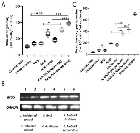 Evaluation of nitrites from amastigotes was done by using a Griess reagent and performing semi-quantitative PCR for genes specific for mice inducible nitric oxide synthase (iNOS) and GAPDH. Reverse transcription was executed using 1 μg of total RNA employing a cDNA synthesis kit (Roche, Carlsbad, CA, USA). The synthesized cDNA was amplified by PCR. The primers used for iNOS and GAPDH were as follows: Forward iNOS: AGGAGGAGAGAGATCCGATTTAG Reverse iNOS: TCAGACTTCCCTGTCTCAGTAG Forward GAPDH: TGCATCCTGCACCACCAACT, and Reverse GAPDH: TGGGATGACCTTGCCCACAG, respectively (Supplementary Materials S3). Obtained product lengths were 125 bp and 220 bp for IFN-γ, IL-10, TNF-α, and GAPDH, respectively, whereas, a ROS assay was performed by ELISA using H2DCFDA (2′,7′-dichlorodihydrofluorescein diacetate) (Supplementary Materials S4).