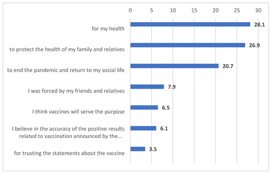 In the study sample, 79.98% were vaccinated. Participants’ reasons for being and not being vaccinated are outlined in Figure 1 and Figure 2. According to these data, 55% of the participants stated that they were vaccinated to protect their health, families, and relatives. On the other hand, 68.7% of the participants who had not been vaccinated stated that they did not get vaccinated or at one point had planned not to get vaccinated because they did not trust the vaccine content or the country where the vaccine was produced, they were afraid of the side effects of the vaccine, and/or they did not have enough information about the vaccine.