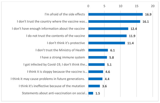 The reasons for hesitating to and deciding not to get vaccinated uncovered in our study parallel those mentioned in the literature [51,52]. Lack of confidence and knowledge is the main reason for vaccine hesitancy and non-vaccination. Numerous studies on vaccine safety that prompt hesitation about side effects [9,10,11,12] encourage the answers “I am afraid of the side effects” and “I do not trust the content of the vaccine”, which are among the reasons for not being vaccinated we found. The anti-vaccine “low disease threat” and “ineffectiveness of vaccines” arguments claimed by Dubé et al. [30] are similar to the answers “not being thought to be protective” and “belief that the immune system will overcome the disease” in our study. In our research, “not trusting the country where the vaccine was produced”, as one of the notable dimensions of distrust, coincides with the claim that “the vaccine was introduced by colonial powers” in the first anti-vaccine movements [22].