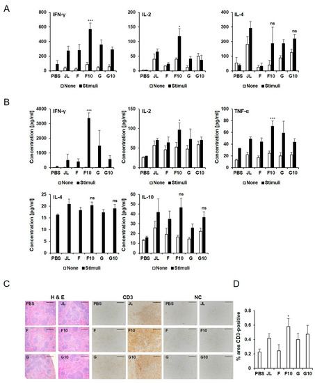 To examine the activation of cytotoxic T cells and T helper cells, CD3 levels in the spleen were examined. As shown in Figure 2C,D, increased CD3 levels were observed in F10 immunized mice compared with JL immunized mice. A histological analysis of the spleen revealed no significant differences among all groups after vaccination.
