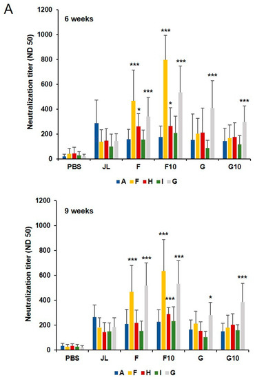 Longevity of humoral immunity of inactivated mumps vaccine candidates. (A) Serum-neutralizing antibody responses against diverse genotypes of MuV at 6 and 9 weeks. The average number of spots was calculated in triplicate. The results of 50% neutralizing antibody titers are presented as the mean values from individual mice (N = 10). Neutralizing antibodies against the F, H, and G MuV genotypes were significantly higher in the F10 immunized group (n = 5) compared to the JL immunized group. * p < 0.05, *** p < 0.005 analyzed by unpaired t-test.
