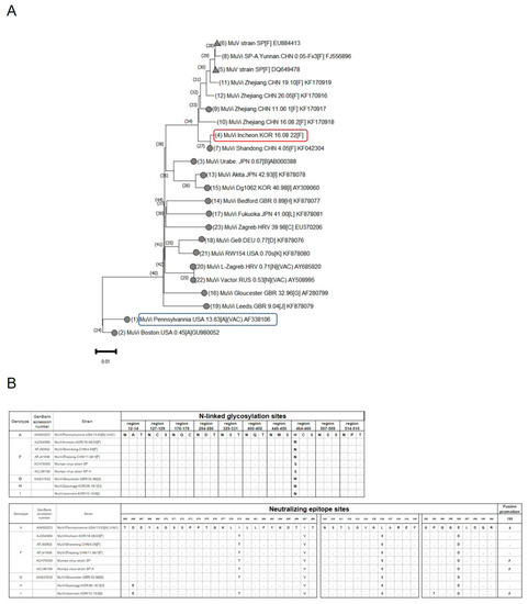 Phylogenetic analysis. (A) Whole genome sequencing (WGS) phylogenetic tree. The WGS phylogenetic tree was constructed using the nearly complete genomes (15,349 nucleotides) of wild-type Korean MuV isolates, strain SP, which has been previously studied as an attenuated vaccine labeled with triangles, and 16 WHO reference viruses labeled with circles in NCBI’s GenBank sequence database. The blue box is the current vaccine strain and red box is the inactivated F genotype mumps vaccine (F10) which is the candidate developed in this study. (B) N-linked glycosylation sites and neutralizing epitope sites of HN protein sequences were compared between the wild-type and vaccine strains (MuVi. Pennsylvania.USA.13.63) MuV. Fusion promotion site amino acid 195 of the F protein in the wild-type and vaccine strain MuV.