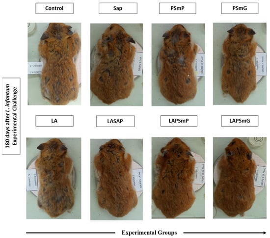 The animals were observed after each inoculum for possible adverse post-vaccination reactions. The presence of non-ulcerated nodules, of firm consistency, were observed in two animals from the PSmG group. Moreover, one animal from the LAPSmG group developed an ulcerated nodule that measured 3 × 3 mm. Although these nodules were transiently observed, the animals showed no signs of pain or behavioral changes. After 180 days of L. infantum experimental infection, the control groups (C, PSmG, PSmG, and LA) were those with more evident dermatological changes, such as alopecia, as compared to animals vaccinated with LAPSmG and LAPSmP, as shown in Figure 1.
