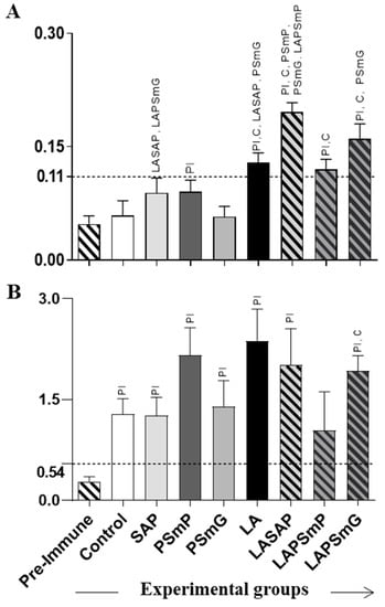 Thirty days after the last inoculum, the PSmP, LA, LASAP, LAPSmP, and LAPSmG groups exhibited higher levels of total anti-Leishmania IgG antibodies in relation to PI (p < 0.05; p < 0.001; p < 0.0001; p < 0.01; p < 0.001, respectively—Figure 2A). The LA, LASAP, LAPSmP, and LAPSmG groups showed increased total anti-Leishmania IgG production, as compared with C (p < 0.05; p < 0.0001; p < 0.05; p < 0.01, respectively—Figure 2A). LASAP and LAPSmG displayed high IgG levels as compared to SAP group (p < 0,.01; p < 0.05, respectively—Figure 2A). Furthermore, LASAP produced higher IgG levels as compared to the LAPSmP (p < 0.01) and LA groups (p < 0.01) (Figure 2A). The LAPSmG group showed an increased in IgG production relative to the PSmG group (p < 0.01). After the experimental challenge (Figure 2B), the C, SAP, PSmP, PSmG, LA, LASAP, and LAPSmG groups presented higher total IgG levels as compared with PI (p < 0.01; p < 0.05; p < 0.01; p < 0.05; p < 0.01; p < 0.05; p < 0.001, respectively). Moreover, the LAPSmG group showed an increase in IgG levels as compared to the control group (p < 0.05).