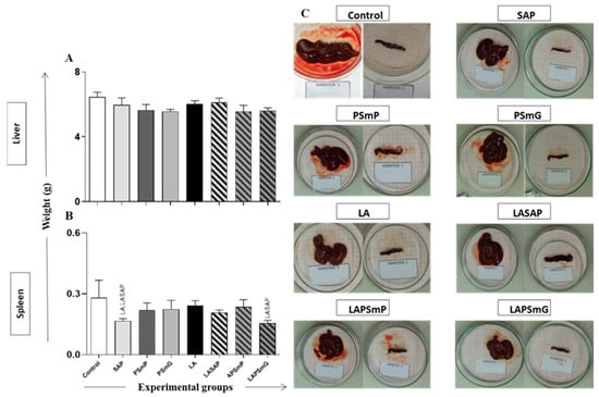 The weights of the spleen and liver were compared after the animals had been euthanized. No statistical differences were observed in the liver weight (Figure 3A,C). In contrast, reduced spleen weights were observed in the SAP group relative to the LA and LASAP group (p < 0.05 for both). Moreover, the LAPSmG group presented reduced spleen weights in relation to the LASAP group (p < 0.05) (Figure 3B,C).