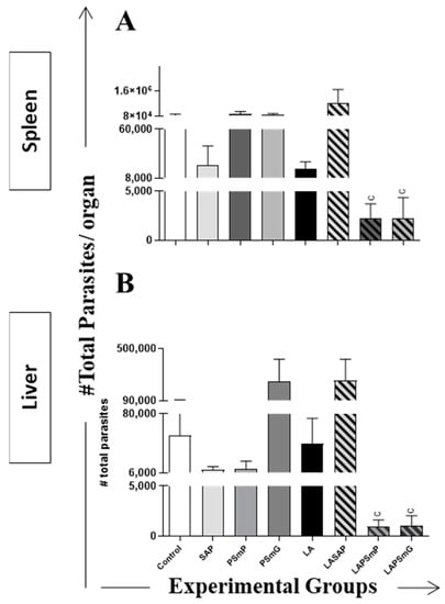 Parasite load in the spleen (A) and liver (B) after L. infantum experimental challenge, according to qPCR reaction. The x axis represents the experimental groups and the y axis represents the mean ± standard deviation of parasite quantification in 106 cells of each organ. The statistical difference (p < 0.05), when present, was represented by the acronym of the corresponding group. Legend: C: control; SAP: saponin; PSmP: small empty submicron particle; PSmG: large empty submicron particle; LA: L. amazonensis crude antigen; LASAP: L. amazonensis crude antigen associated with saponin; LAPSmP: small submicron particle associated with L. amazonensis; LAPSmG: large submicron particle associated with L. amazonensis.
