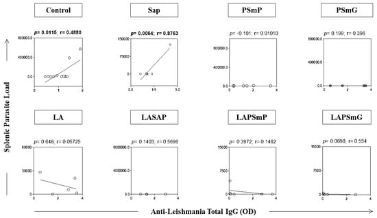 Correlation between splenic parasite load and total anti-Leishmania total IgG levels displayed as “◯”. The statistical difference was considered when p < 0.05. Legend: SAP: saponin; PSmP: small empty submicron particle; PSmG: large empty submicron particle; LA: L. amazonensis crude antigen; LASAP: L. amazonensis crude antigen associated with saponin; LAPSmP: small submicron particle associated with L. amazonensis; LAPSmG: large submicron particle associated with L. amazonensis.