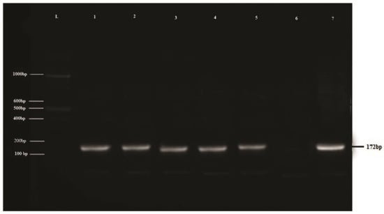 A positive PCR amplicon (172 bp) of the RPO30 gene for LSDV was identified through agarose gel electrophoresis. DNA extracted from different LSD clinical samples yields a clear band in the gel electrophoresis after amplifying the target gene (Figure 1).