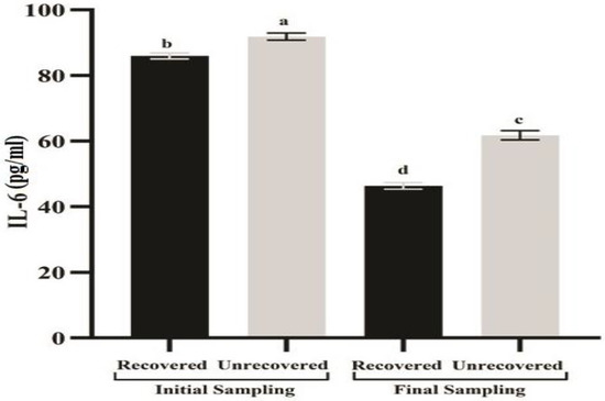 Figure 2. Comparison of serum IL-6 concentration in LSDV infected cattle. Means (±SEM) without a common superscript letter differ significantly (p < 0.05). The infected cattle were grouped by recovery at 17 days after baseline sampling. The serum IL-6 concentrations of the recovered group (n = 33) and the unrecovered group (n = 17) were analyzed by two-way ANOVA and the Tukey test.