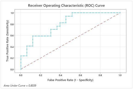 In the context of disease progression, the unrecovered cattle revealed significantly higher levels of IL-6 mean value (92 ± 1.1 pg/mL) at baseline sampling compared with the recovered cattle (86 ± 0.92 pg/ mL). Moreover, at final sampling, the values were 62 ± 1.5 pg/mL and 33 ± 0.88 pg/mL for unrecovered and recovered cattle, respectively (Figure 2). The binary logistic regression analysis regarding serum IL-6 showed statistical significance, as the results for the P-value of the Hosmer–Lemeshow test were nonsignificant (p = 0.225). The Wald statistic showed a significant impact of serum IL-6 concentration in the regression model (p = 0.002). The likelihood (odds ratio 1.26; 95% CI 1.0902, 1.4510) of LSD persistence in cattle increased by 26% for each unit of increase in serum IL-6. The prognostic quality of serum IL-6 concentration (Figure 2) regarding the clinical consequence of infection was calculated in a ROC analysis.