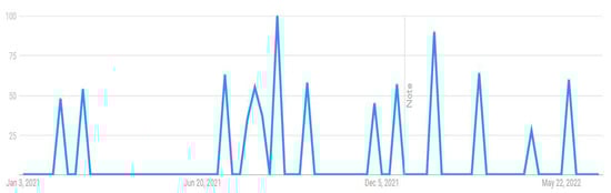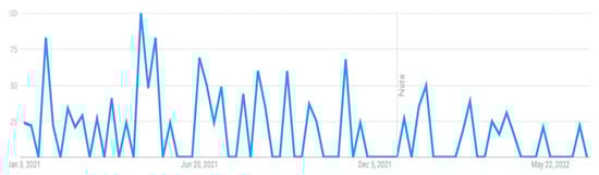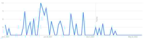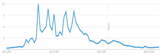 This research attempted to visualize the public searches about the COVID-19 vaccine from 1 January 2021 to 30 June 2022. Through the Google Trends feature, researchers can visualize the popularity of a particular search term on Google over time. This can help to gain insight into the patterns of public interest in the topic during a particular period with real-time frequencies. For example, when someone searches for a term on Trends, it can help him or her view a graph showing its popularity in (nearly) real time. Using the mouse’s cursor over the graph, one can see a number that reflects the term’s relative popularity based on the total number of searches conducted on Google. The numbers on the graph in Figure 1, Figure 2, Figure 3 and Figure 4 are not absolute search volume numbers but are presented on a scale from 0 to 100, with each point on the graph being divided by the highest point (100).