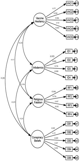 The study employed the structural equation modeling technique to verify the (a) measurement model fitness, (b) convergent and discriminant validity, and (c) possibility of multidimensionality. To do so, all items were loaded on the parent constructs of infodemics, conspiracy beliefs, religious fatalism, and vaccine hesitancy to carry out the confirmatory factor analysis (hereafter CFA) using AMOS 24.0. The results of the CFA demonstrated that infodemics, conspiracy beliefs, religious fatalism, and vaccine hesitancy were empirically distinct (see Table 2). The six fit indices were evaluated to assess the goodness of the measurement model. The results revealed a good fit model after deletion of two items as; x2 = 1427, x2/df = 2.73 CFI = 0.96, GFI = 0.93, NFI = 0.93, TLI = 0.96, and RMSEA = 0.048 [77]. The item loadings are reported in Table 3 and Figure 5.