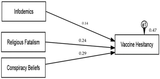 This study postulated three hypotheses delineating the direct impact of infodemics (H1), conspiracy belief (H2), and religious fatalism (H3) on vaccine hesitancy. The path analysis was performed on AMOS 24.0 after computing the variables after the deletion of the items during CFA. The analysis results demonstrated that the infodemics significantly predict vaccine hesitancy (β = 0.14), in support of H1. The results also revealed that conspiracy beliefs significantly predict vaccine hesitancy (β = 0.29), and H2 was supported (see Table 5 and Figure 6).