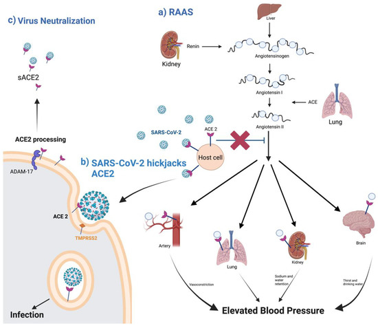 A schematic diagram of ACE2 pathways. (a) the regulation of the renin–angiotensin system. (b) ACE2 as SARS-CoV-2 receptor, leading to the internalization and infection of the virus. (c) ACE2 processing by ADAM-17, leading to the release of sACE2 and the possible blockage of SARS-CoV-2 infection. Created with BioRender.com.
