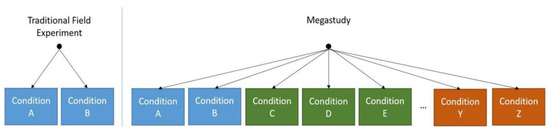 - Broad Vision: Compared to traditional single RCTs, megastudies may find unexpected outstanding interventions. Because traditional RCT studies usually test hypotheses, researchers suppose the most likely option and do not try those in which the researcher has little confidence. Hence, they may miss interventions that appear less promising but are, in fact, highly effective [38,40]. In megastudies, different teams present different interventions and may apply interventions of which they are less confident [44].