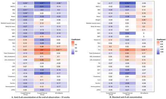 Correlations between clinical parameters and antibody responses (A) anti-S-ab concentration at the end-of-observation—19 weeks; (B) maximal anti-S-ab concentration). Significance levels: * p < 0.05; ** p < 0.01; Abbreviations: HBA1c—Glycated A1c Fraction of Hemoglobin; BMI—Body Mass Index; Hip—Hip Circumference; Waist—Waist Circumference; SBP—Systolic Blood Pressure; DBP—Diastolic Blood Pressure; TSH—Thyroid Stimulating Hormone; fT3—Free Triiodothyronine; fT4—Free Thyroxine; HDL—High Density Lipoprotein Cholesterol; LDL—Low Density Lipoprotein Cholesterol; TG—Triglycerides; CRP—C-Reactive Protein; AST—Aspartate Aminotransferase; ALT—Alanine Aminotransferase; IL-6—Interleukin-6; Fat%—Body Fat Percentage; aTPO—Anti-Thyroid Peroxidase Antibodies.