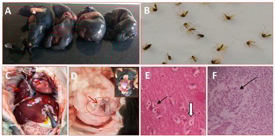 Japanese encephalitis (JE) case specimens of the current study. Here, (A) Stillborn fetuses in a sow due to JE infection during pregnancy, (B) A pool of Culex tritaeniorhynchus mosquito, a major vector of JEV transmission, (C) Congestion in the internal organs (arrow), (D) Encephalitis in the brain in a stillborn foetus affected with JE (arrow), (E) Neuropathology in the cerebrum of a JEV-infected stillborn piglet. Neuronophagia and satellites (arrow), neuronal vacuolation (arrowheads) hematoxylin and eosin stained, 20× magnification. (F) Lymphoid depletion in the lymphoid follicle of lymph node (arrow) hematoxylin and eosin stained, 20× magnification.