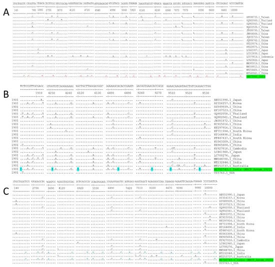 Nucleotide sequence alignment of the polyprotein genes of JEV isolates from mosquito (A), pig (B) and unique nucleotide mutations identification in Indian isolate of current study. (C) Common and unique nucleotides mutation of polyprotein genes of JEV isolates from two Indian strain. Residues identical to the consensus are indicated by dots.