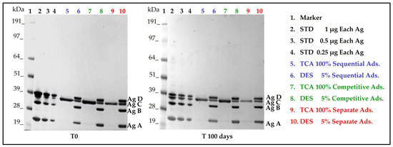 SDS-PAGE results at time points 0 and 100 days which show antigens identity in respect to standard controls and degree of antigens adsorption after steps of centrifugation and separation of supernatants from AlumOH pellet. STD: Standard antigens solution of known amount; Ag: Antigen; TCA: Supernatant precipitated with tri-chloro acetic acid after steps of centrifugation and AlumOH separation; Ads: Adsorption; DES: AlumOH desorbed with desorption buffer following steps of centrifugation and supernatant separation.