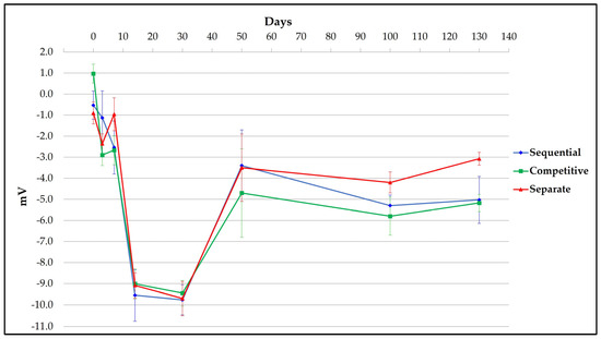 Similar trends were observed for ZP results throughout the kinetic study for each formulation approach used (Figure 5). All formulation samples displayed values that moved from around 0 at the starting point, falling to −10 mV after 30 days. From 50 to 130 days, all formulation samples showed little change in their zeta potential, with values within the range of −3/−5 mV. These dynamic trends reflect changes that are occurring across the bulk AlumOH surface due to an overall shift caused by adsorbed antigens, with no possibility of discriminating the contribution of each single component. A sample of AlumOH at 2 mg/mL, in 10 mM histidine buffer (pH 6.5) and 150 mM NaCl, in absence of antigens, was used as control and displayed a positive value around 22 mV (data not shown).