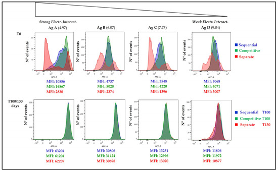 In Figure 6, Figure 7 and Figure 8 histograms referring to the distribution of each antigen on AlumOH are displayed after flow cytometry analysis (the strength of the electrostatic interaction decreases from left to right).