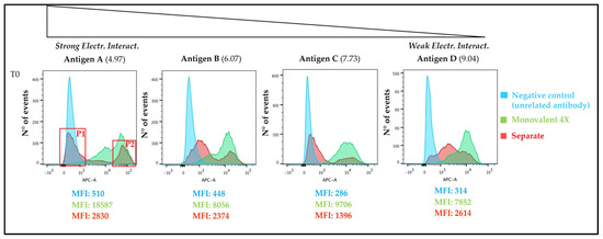 Fluorescence histogram at T0 of separate formulation approach sample (red) in comparison with negative control (light blue) and monovalent formulation (light green) are reported. On the X axis Fluorescence Intensity is reported, while on the Y axis number of events is reported. All numbers refer to Mean Fluorescence Intensity (MFI) values.