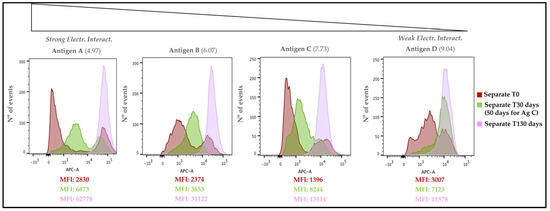 Separate adsorption sample, histogram overlay of time points 0-30-130 days for antigen A, B and D, while of 0-50-130 days for antigen C. On the X axis Fluorescence Intensity is reported, while on the Y axis number of events is reported. All numbers refer to Mean Fluorescence Intensity (MFI) values.