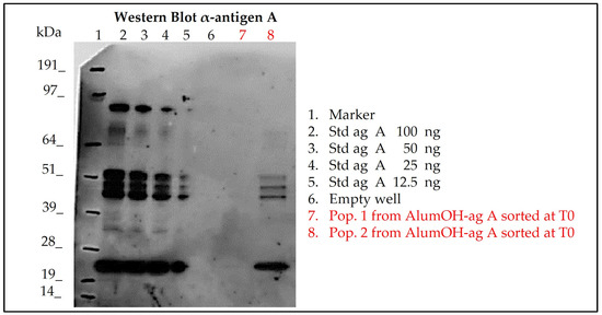 WB analysis after incubation with antigen A sera (Figure 9) of the sorted AlumOH populations P1 and P2 clearly confirmed the flow cytometry results (Figure 7): indeed, antigen A was detected only in the P2 population (Figure 9, WB, well 8). This result indicates that the antigen A at T0, due to its strong electrostatic interaction, remains mostly adsorbed on the AlumOH population P2, which derives from the antigen A monovalent sample of separate adsorption sample (see overlay in Figure 7). On the other hand, at T0 no traces of antigen A were detected in P1 population (Figure 9, WB, lane 7). This evidence means that no redistribution of the antigen A from P2 population on remaining AlumOH population P1 occurs immediately. It is noteworthy to mention that AlumOH population P1 derives from the monovalent sample B, C and D used to prepare multivalent separate adsorption sample. It is instead interesting to underline how antigen B, C and D were detected in both populations with a similar content (see Figure S2 on Supplementary Material). This behaviour can be explained since both P1 and P2 populations of separate adsorption sample at T0 were sorted after specific antigen A staining at flow cytometry, and, indeed, they reflected the specific distribution only for antigen A.