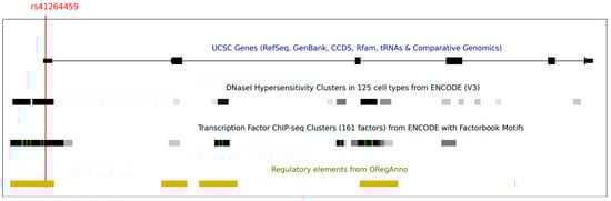 A screenshot from the UCSC genome browser (http://genome.ucsc.edu/, GRCh37/hg19, accessed on 1 December 2022). The panel shows the AIM2 gene and the informative tracks showing DNase hypersensitive areas (from ENCODE), regions of transcription factor binding (from ENCODE), literature-curated regulatory regions and transcription factor binding sites (from OregAnno). The position of variant rs41264459 is also reported.