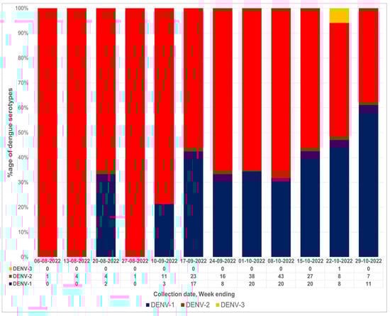 Week-wise distribution of dengue virus serotypes (August–October 2022).