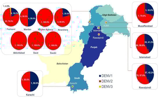 Dengue is a fast-emerging arboviral infection in many countries worldwide, including Pakistan. The prevalence of dengue infection has increased significantly in recent years, and more than half of the world’s population is at risk []. According to WHO, an estimated 100–400 million infections occur each year, and Southeast Asia contributes significantly to the overall disease burden [,]. The first confirmed outbreak of dengue from Pakistan was reported in 1994, but it was not until November 2005 that a yearly epidemic pattern began in Karachi []. Since then, Pakistan experienced sporadic dengue fever outbreaks, which eventually became significant epidemics in 2011, 2017, 2018, and 2019 []. Alarmingly, a significant increase in the number of cases was recorded after 2018 (n = 3204), i.e., 47,120 in 2019 and 52,000 in 2021 [,]. According to data from the National Institute of Health, Pakistan, during 2022 (January to November), Pakistan reported 75,450 cases of dengue, mostly from Khyber Pakhtunkhwa (n = 22,617), followed by Sindh (n = 22,174), Punjab (n = 18,626), Islamabad (n = 5384), Balochistan (n = 5205), and Azad Jammu and Kashmir (n = 1444). Moreover, 136 deaths had been reported (Sindh = 61; Punjab = 45; KP = 18; Islamabad = 11 and Balochistan = 1). A major reason for such an increase in dengue cases during 2022 has been heavy rainfalls in Pakistan, which lead to catastrophic floods causing widespread displacement of people and providing breeding sites for mosquitoes [].