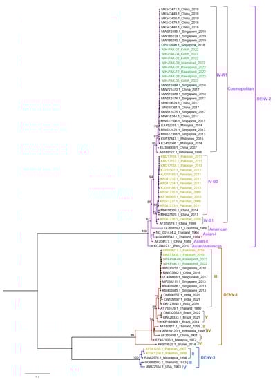 For phylogenetic analysis, the study sequences were subjected to a BLAST search to identify the closely related sequences. Based on BLAST search, the globally reported sequences of the dengue virus along with the reference genomes of all DENV genotypes were downloaded from NCBI (https://www.ncbi.nlm.nih.gov/, accessed on 14 November, 2022). The multiple sequence alignment was performed by MAFFT [], and a scaled phylogenetic tree was generated by maximum likelihood (ML) using IQ-Tree v2.2.0 [] software using GTR + G as a substitution model with a bootstrap confidence limit based on 1000 replicates. The substitution model was chosen using MEGA 11. The tree was visualized and annotated using FigTree v1.4.4 [].