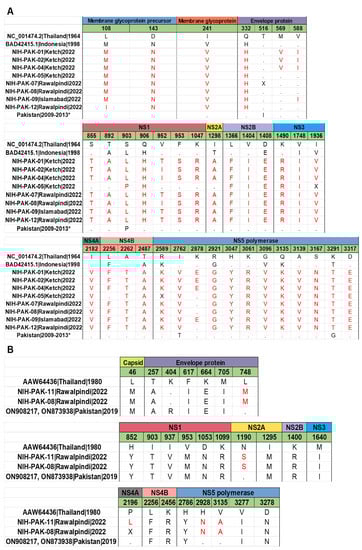 (A) Amino acid variation in the DENV2 study isolates in comparison with the reference strain and previously reported sequences from Pakistan. (B) Amino acid variation in the DENV1 study isolates in comparison with the reference strain and previously reported sequences from Pakistan. The amino acid differences are highlighted in red. X represents the missing amino acid at that position and dot (.) represents the same amino acid as present in the reference genome. * (AIU39216.1, AIU39217.1, AIU39218.1, AIE17400.1, AHM25909.1, AHC72404.1, AHC72406.1, AHC72407.1, AHC72405.1, AHM25910.1).
