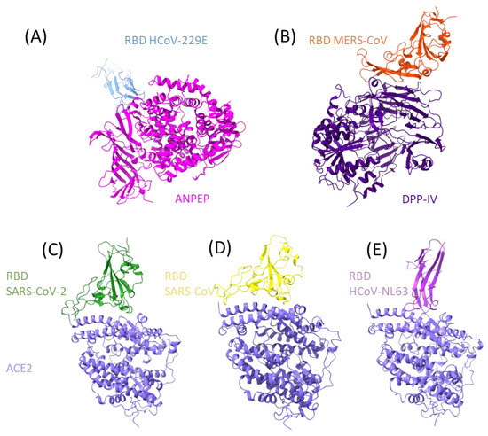 Coronaviruses are known to primarily use a host receptor, which can be either a protein or a carbohydrate [17]. It is hypothesized that an ancient coronavirus acquired a host galectin sequence that resulted in the ability to bind carbohydrates, so binding to carbohydrates is a more recent feature [18]. Even though each coronavirus has a primary host receptor, it has been shown that several S proteins can bind to other components of the cell membrane [19,20,21]. Even more, the S protein’s glycosylation can also interact with the lectins of the host [20]. The reported protein receptors employed by mammalian coronaviruses are the murine carcinoembryonic antigen-related cell adhesion molecule 1a (mCEACAM 1a), aminopeptidase N (ANPEP also CD13), dipeptidyl protease IV (DPP- IV also CD26), and angiotensin converting enzyme 2 (ACE2) [17]. Since the first one is receptor for the murine hepatitis virus (MHV) and it does not infect humans, herein, we will discuss the other three enzymes solely.