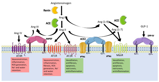 Figure 3 can help to understand the global RAAS. The juxtaglomerular cells in the kidneys cleave pro-renin in response to a drop in blood pressure and sodium in blood. Following this, renin cleaves angiotensinogen to produce angiotensin I, which in turn is transformed to angiotensin II (Ang II) by the angiotensin converting enzyme (ACE). The two receptors for Ang II, type I (AT1R), and type II receptors (AT2R) cause a variety of effects depending on tissue and receptor type. For example, vasoconstriction is induced via AT1R, which increases sodium reabsorption in the kidney and stimulates the production of aldosterone in the adrenal cortex; in the brain, they promote water intake and retention via the hypothalamus–pituitary gland axis, which releases the antidiuretic hormone [75,81]. The overall consequence is an increase in vasculature tone. AT2R is associated to wound healing and tissue repair, inhibits ACE, and enhances the activity of angiotensin receptor blockers (ARB) [82].