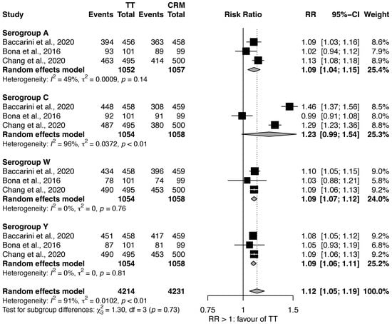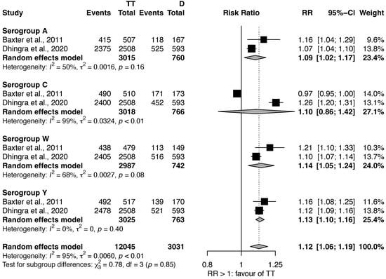 Three studies compared the efficacy of MenACWY-TT against MenACWY-D [,,]. The metanalysis (Figure 2) was performed only on two studies [,], as Halperin et al. [], presented the proportion of subjects with SBA titers ≥ 1:8 only using a graphical chart, from which was not possible to gather original data. Also in this case, a statistically significant effect was found for serogroup A (RR: 1.09, 95% CI: 1.02–1.17), W (RR: 1.14, 95% CI: 1.05–1.24), and Y (RR: 1.13, 95% CI: 1.10–1.16), but not for C (RR: 1.10, 95% CI: 0.86–1.42). Moreover, the heterogeneity for serogroup C was very high (I2: 99%).