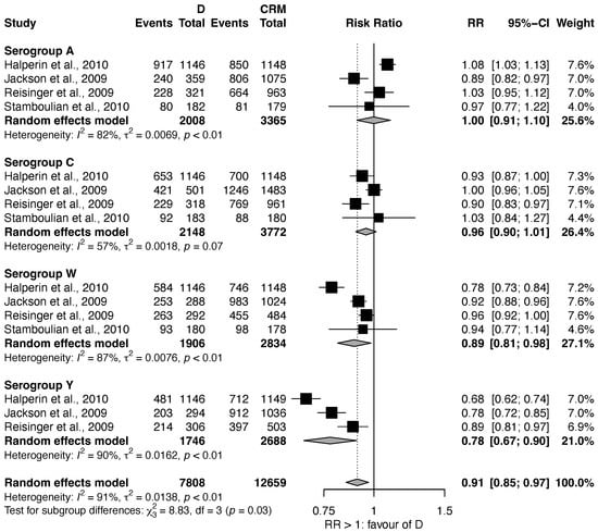 The efficacy of MenACWY-D vs. MenACWY-CRM was investigated in four studies [,,,]. MenACWY-D was significantly less effective than MenACWY-CRM for serogroups W (RR: 0.89, 95% CI: 0.81–0.98) and Y (RR: 0.78, 95% CI: 0.67–0.90), while no significant difference was found for serogroups A (RR: 1.00, 95% CI: 0.91–1.10) and C (RR: 0.96, 95% CI: 0.90–1.01) (Figure 3). For all the serogroups, a substantial heterogeneity in the estimates was found.