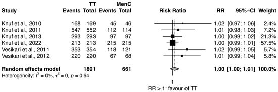 Limitedly to serogroup C, six studies [,,,,,] compared the efficacy of MenACWY-TT against MenC. The RR was 1.00 (95% CI 1.00–1.01) with very low heterogeneity (Figure 4).