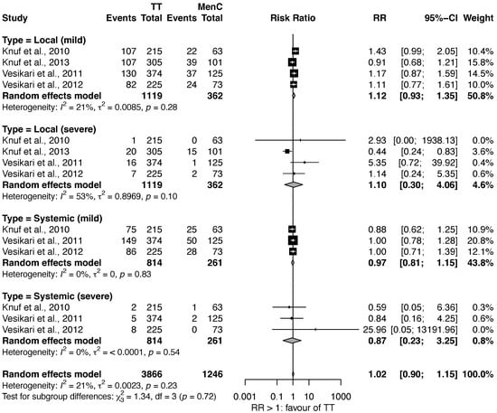 Five studies compared the safety of MenACWY-TT against MenC [,,,,]. Similar to Review 2, none of the included studies compared the safety of MenACWY-D or MenACWY-CRM versus MenC. As shown in Figure 5, we did not find significant differences in the frequency of AE (RR: 1.02, 95% CI: 0.90–1.15). Also, subgroup analysis did not show substantial differences (Local mild reactions, RR: 1.12, 95% CI: 0.93–1.35; Local severe reactions, RR: 1.10, 95% CI: 0.30–4.06; Systemic mild reactions, RR: 0.97, 95% CI: 0.81–1.15; Systemic severe reactions, RR: 0.87, 95% CI: 0.23–3.25) Heterogeneity ranged between 0% and 53% in the different analyses. One of the studies was not included in the meta-analysis as it was based on a different AE classification [].
